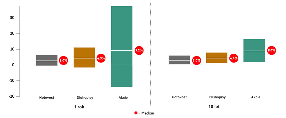 Obrázek 2: Očekávaný rozsah výnosů hotovosti, dluhopisů a akcií podle společnosti Vanguard za 1, respektive 10 let.